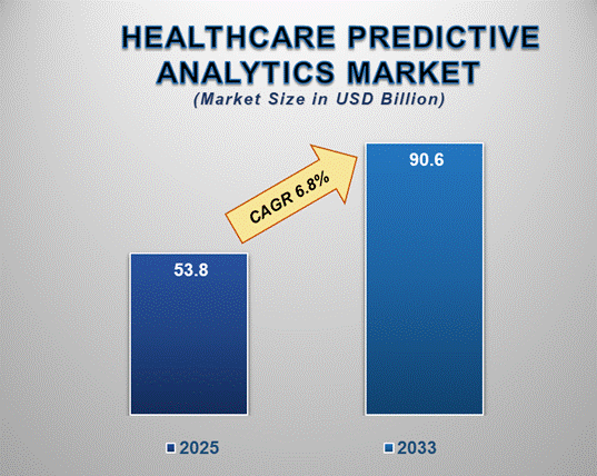 The healthcare predictive analytics market is anticipated to experience substantial growth from 2025 to 2033. The increasing focus of healthcare providers on value-based healthcare is also anticipated to influence the demand for predictive healthcare analytics, strengthening their position in the market. With an estimated valuation of approximately USD 53.8 billion in 2025, the market is expected to reach USD 90.6 billion by 2033, registering a robust compound annual growth rate (CAGR) of 6.8% over the decade.