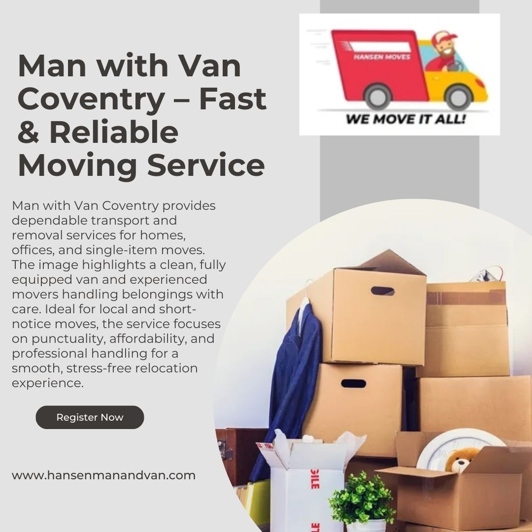 Man with Van Coventry provides dependable transport and removal services for homes, offices, and single-item moves. The image highlights a clean, fully equipped van and experienced movers handling belongings with care. Ideal for local and short-notice moves, the service focuses on punctuality, affordability, and professional handling for a smooth, stress-free relocation experience. For more information:-https://hansenmanandvan.com/man-and-van-1Man with Van Coventry – Fast & Reliable Moving Service Man with Van Coventry provides dependable transport and removal services for homes, offices, and single-item moves. The image highlights a clean, fully equipped van and experienced movers handling belongings with care. Ideal for local and short-notice moves, the service focuses on punctuality, affordability, and professional handling for a smooth, stress-free relocation experience. For more information:-https://hansenmanandvan.com/man-and-van-10 Comments 0 Shares 218 Views - Hansen Man and Van